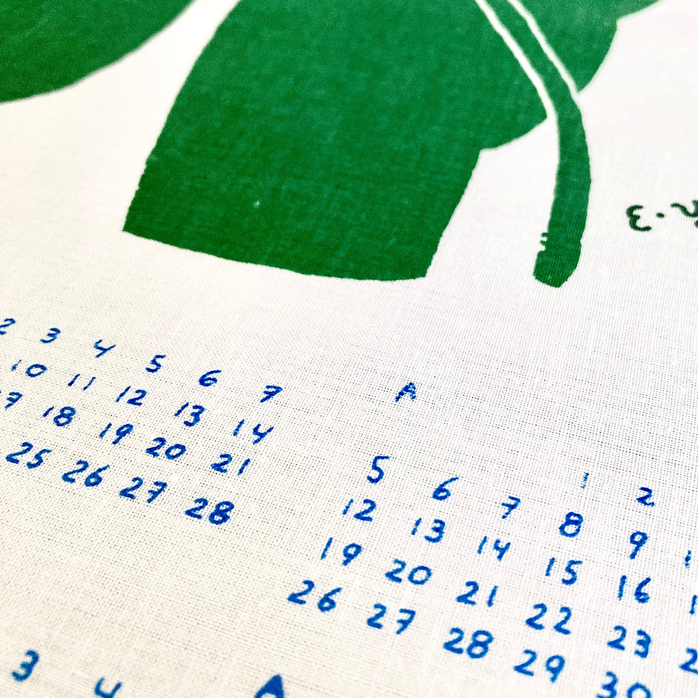 手刷りのシルクスクリーンプリントで制作した布製のカレンダーです。端は切りっぱなしです。